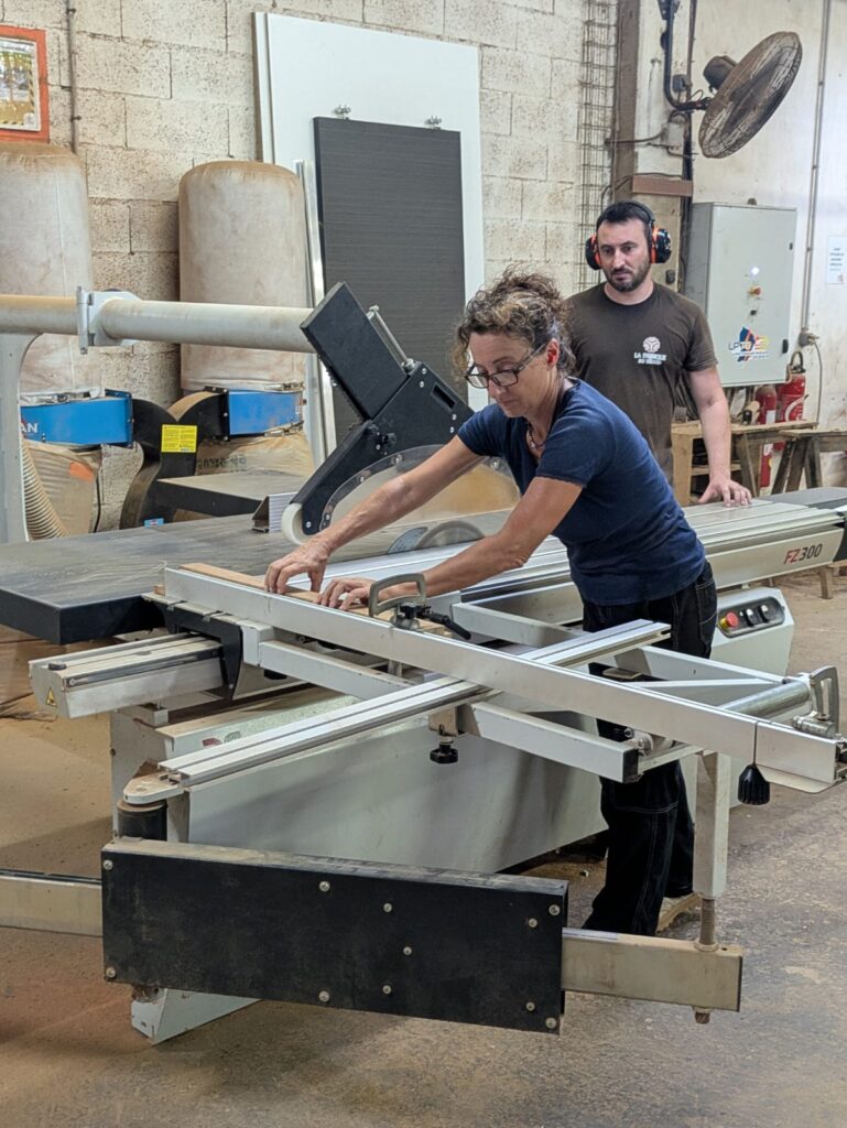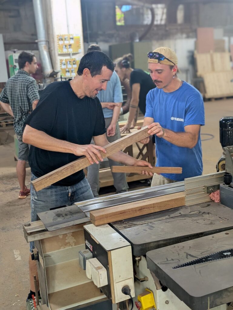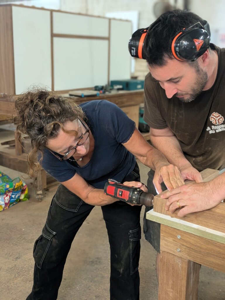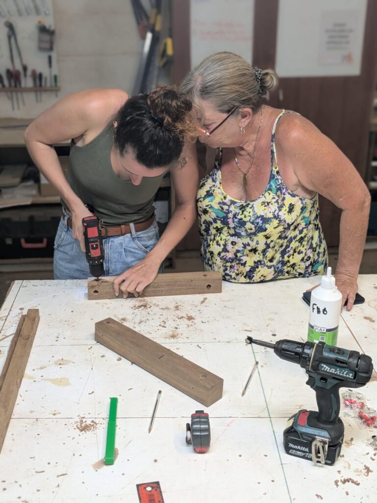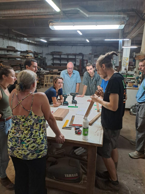 Au fil de la journée, chacun a pu participer aux différentes étapes : découpe, ponçage, assemblage, finition… Un vrai travail collaboratif où chaque geste comptait. Un grand merci à Victor et Charly, nos anges gardiens du bois : grâce à eux, aucun doigt coincé, aucun meuble tordu… et beaucoup de rires !!! sans leur vigilance, certains auraient peut-être inventé la première table basse… à trois pieds ou une table cubiste façon Picasso …